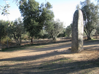 Para além do Recinto Megalítico dos Almendres visitámos também o Menir dos Almendres, cuja localização está claramente relacionada com a do primeiro, uma vez que corresponde a uma direcção astronómica elementar: o menir, visto a partir do recinto, indica a posição do nascer do Sol, no dia maior do ano, o dia do Solstício de Verão.