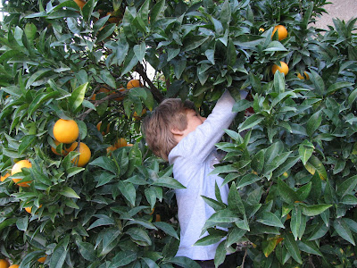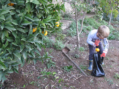 E mais à esquerda, a laranjeira já cheira. Muitas laranjas já caídas no chão, outras a apodrecer nos ramos e outras, muitas e muitas à nossa espera para serem colhidas. Ainda não estão maduras mas sente-se já o doce que serão daqui a pouco tempo.
