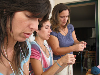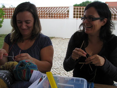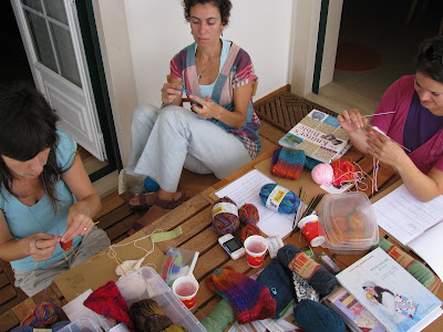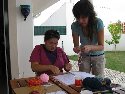 As lãs e agulhas vieram da retrosaria da Rosa. A professora é a Zélia. Em breve haverão workshops para as muitas interessadas que por aí andam.