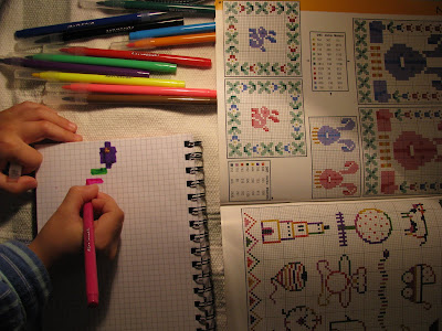 depois do jantar, regressamos à minha infância e colorimos papeis quadriculados com a ajuda de revistas de ponto de cruz. Ele gosta da matemática, da ordem e da lógica bem como das novas canetas de feltro. Eu gosto dele e de o ver crescer, de ouvir o vento lá fora, de ver um filme em família com pipocas saídas da panela.
