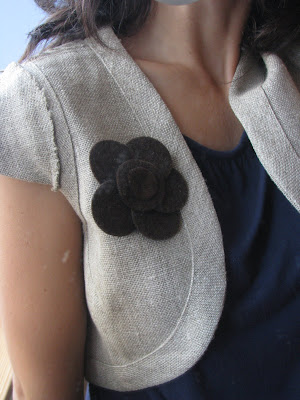 Não posso esquecer de mencionar este lindo colete que encontrei na Feira de Artesanato do Estoril. Foi uma felicidade encontrar, no meio de tanto não-artesanato, este espaço. O colete é simplesmente lindo, executado com rigor e muito bom gosto, com aquele ar rústico de que tanto gosto! O senhor ainda me ofereceu uma pregadeira feita em burel, também ela muito bonita, que veio completar o look final.